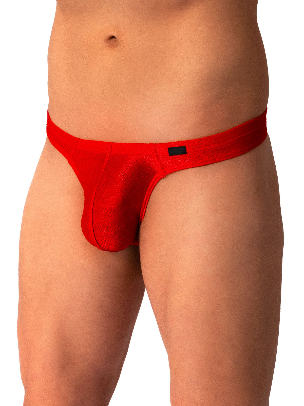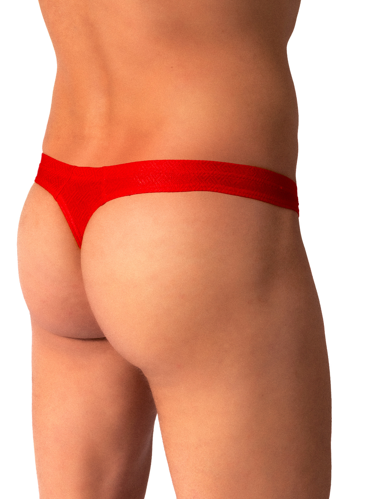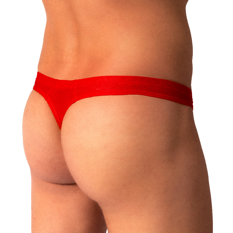 Tanga z měkké žakárové látky s texturou na povrchu a jemným leskem.