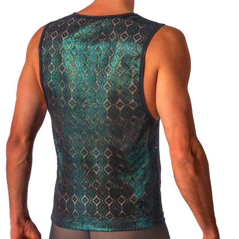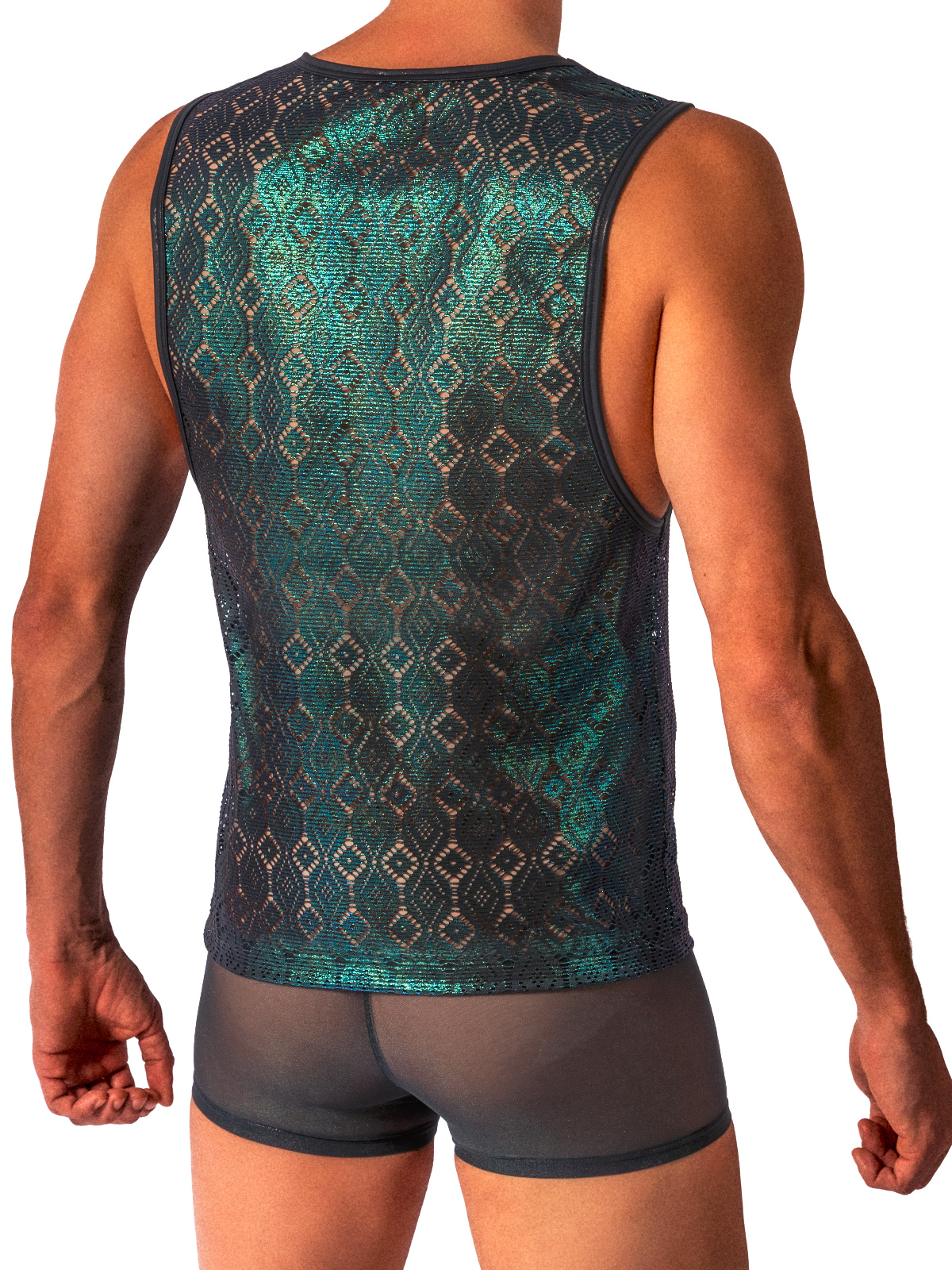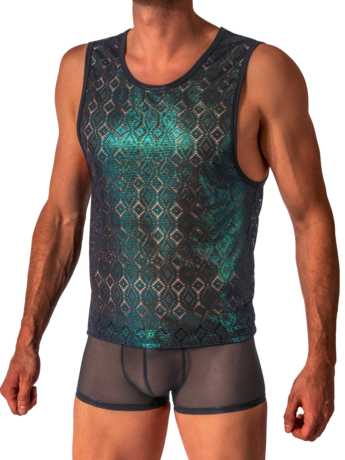 Síťované tílko s fialovo-zeleným třpytem z měkké a vzdušné látky. Moderní střih nebrání pohybu. Skvělá kousek pro okouzlující outfit nejen na párty.